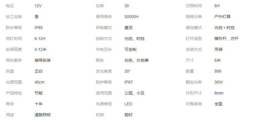 智慧太陽能道路燈 電壓12V 功率35 日照時間6H 使用壽命50000H