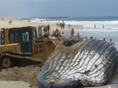 巨大鯨魚(yú)擱淺海灘,救援人員用推土機(jī)不小心推死!